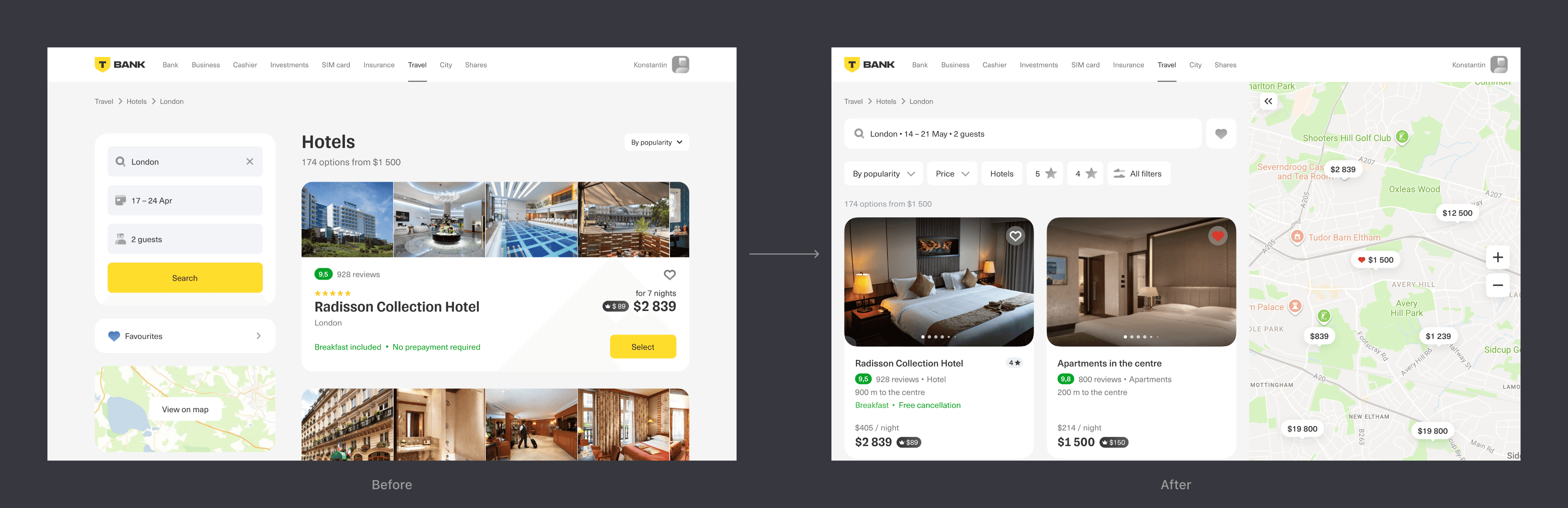 The user experienced difficulties browsing and selecting hotels in the search results of the hotel booking service. High drop-off rate from the search results page. The design was outdated, and the hotel card had become hard to scale.