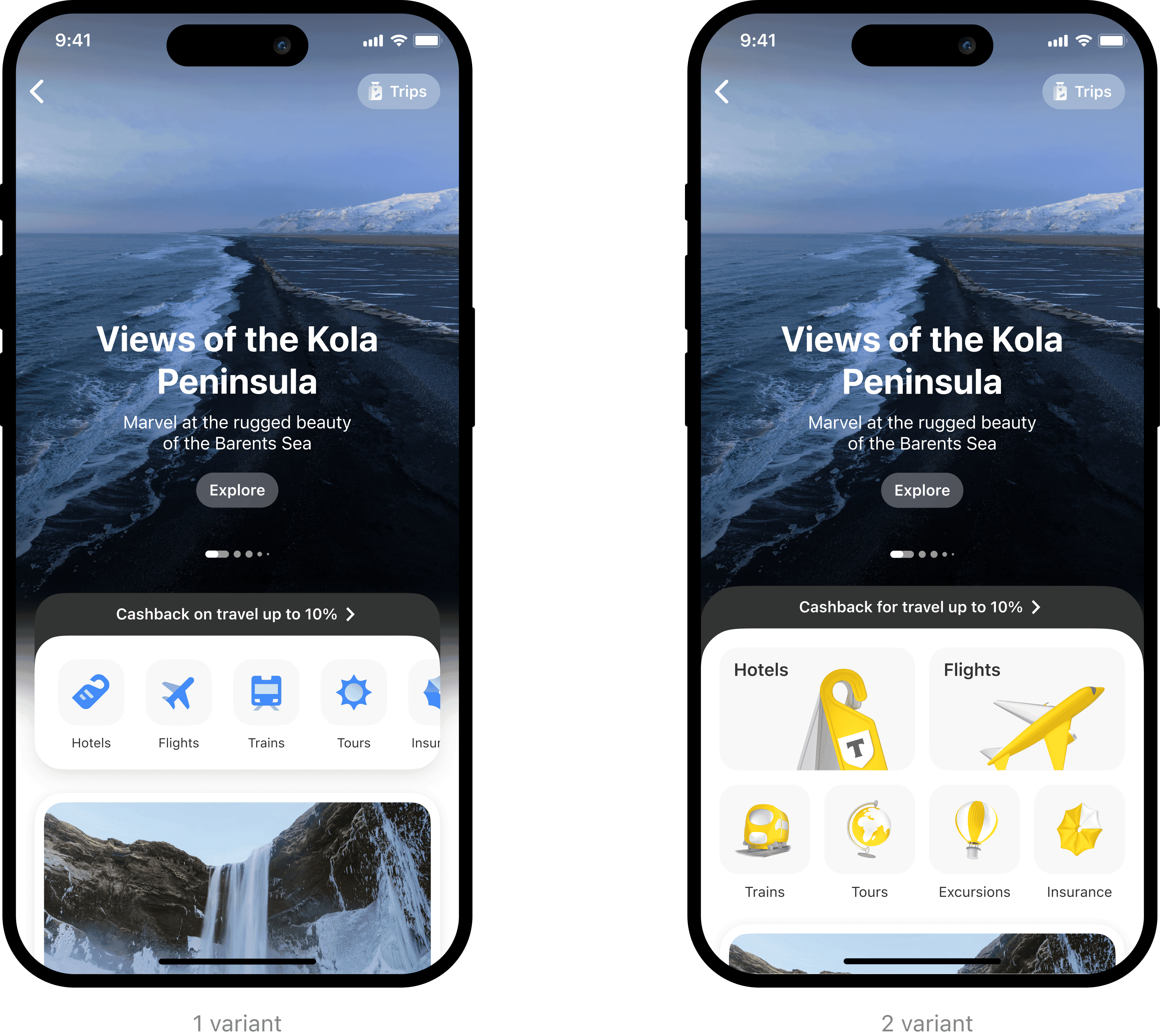 In the first iteration, we decided to keep the links to the main pages of the services. We consolidated entry points to travel services into a single block. We conducted an A/B test with two variants, and the navigation with horizontal scrolling statistically performed significantly better.