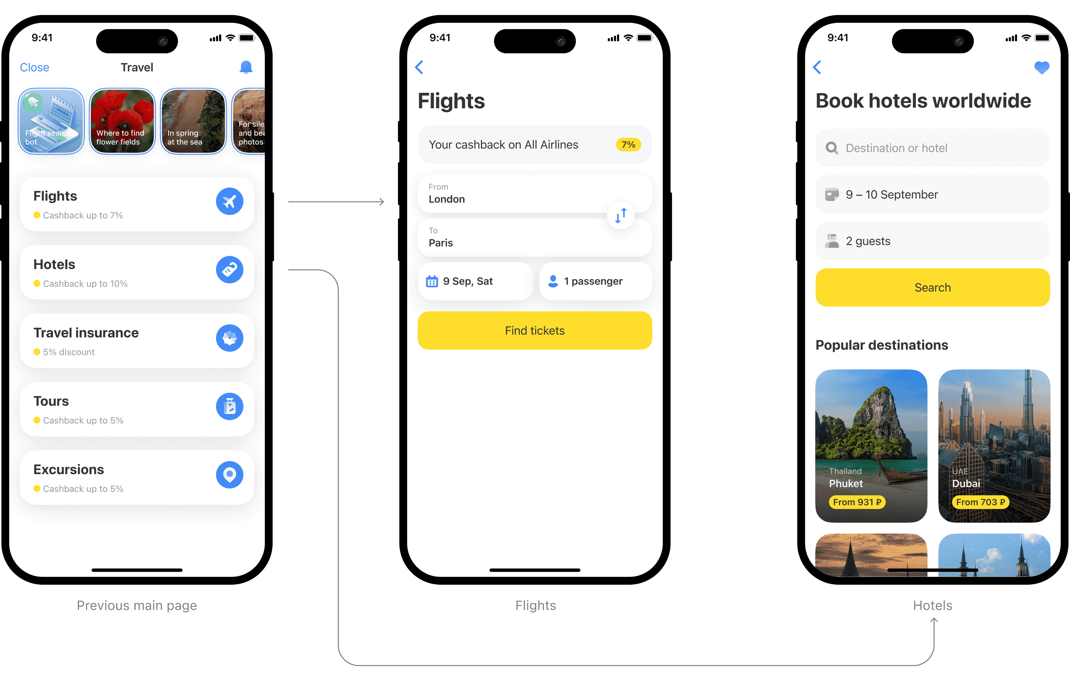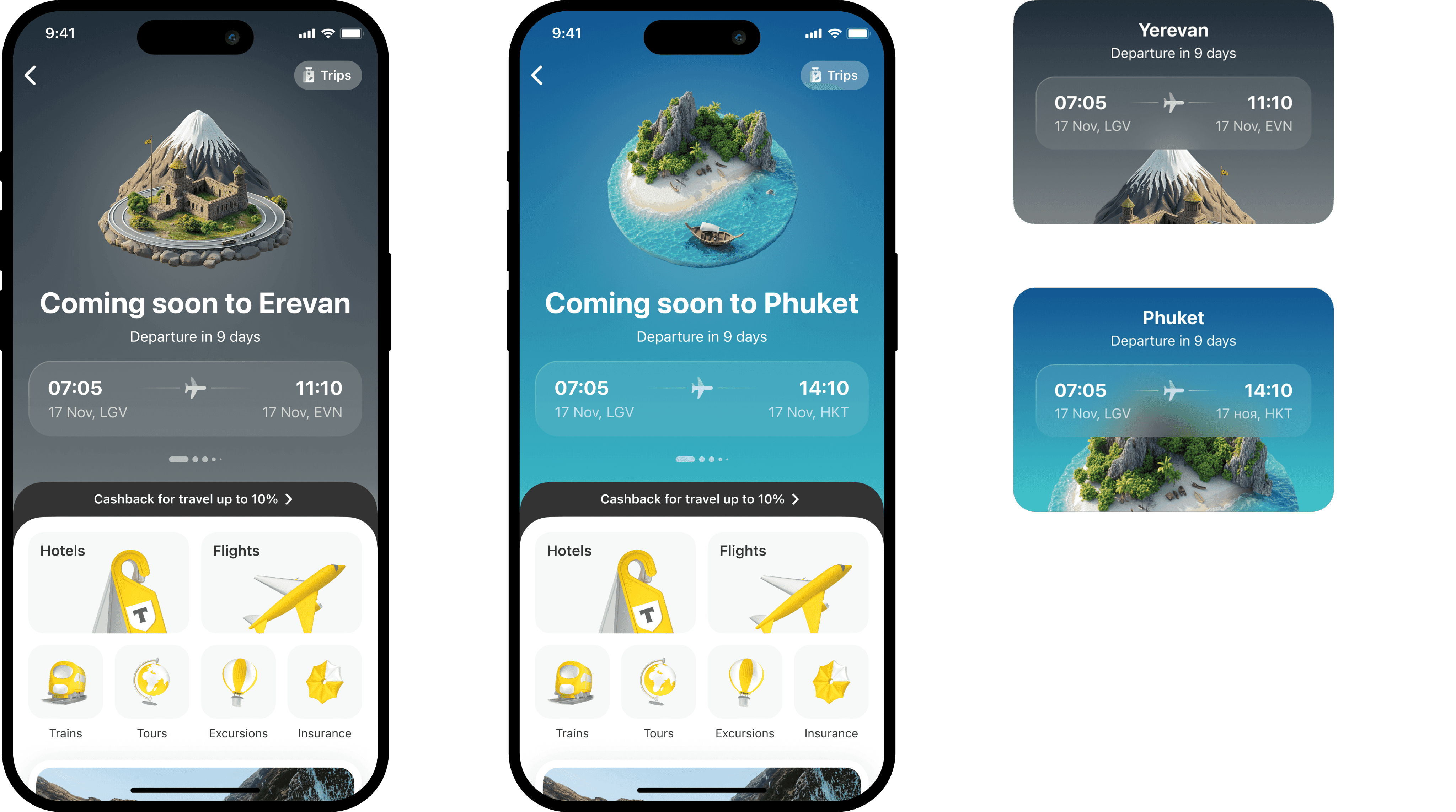 After the discovery phase, we, along with the product team, compiled a large list of ideas on how to develop the travel sphere. I transformed these ideas into concepts to facilitate prioritization and evaluation. Additionally, we had the opportunity to place our widget on the bank's homepage to increase brand recognition and service penetration.
