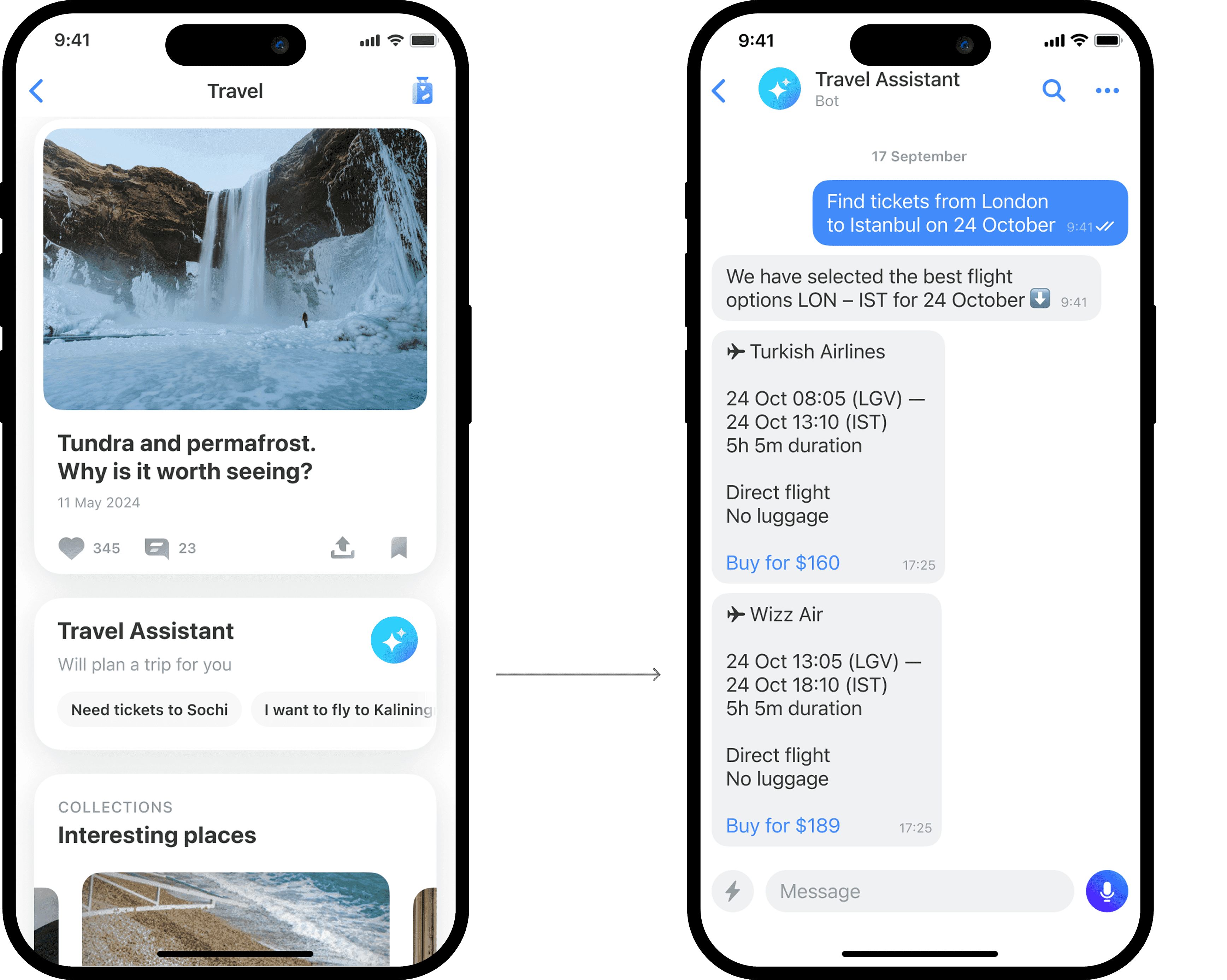 Questions like «How to get there?», «Where to stay?», and «What to do?» are answered by the travel assistant, which helps not only to pick tickets but also to plan, for instance, a walking route during the trip.