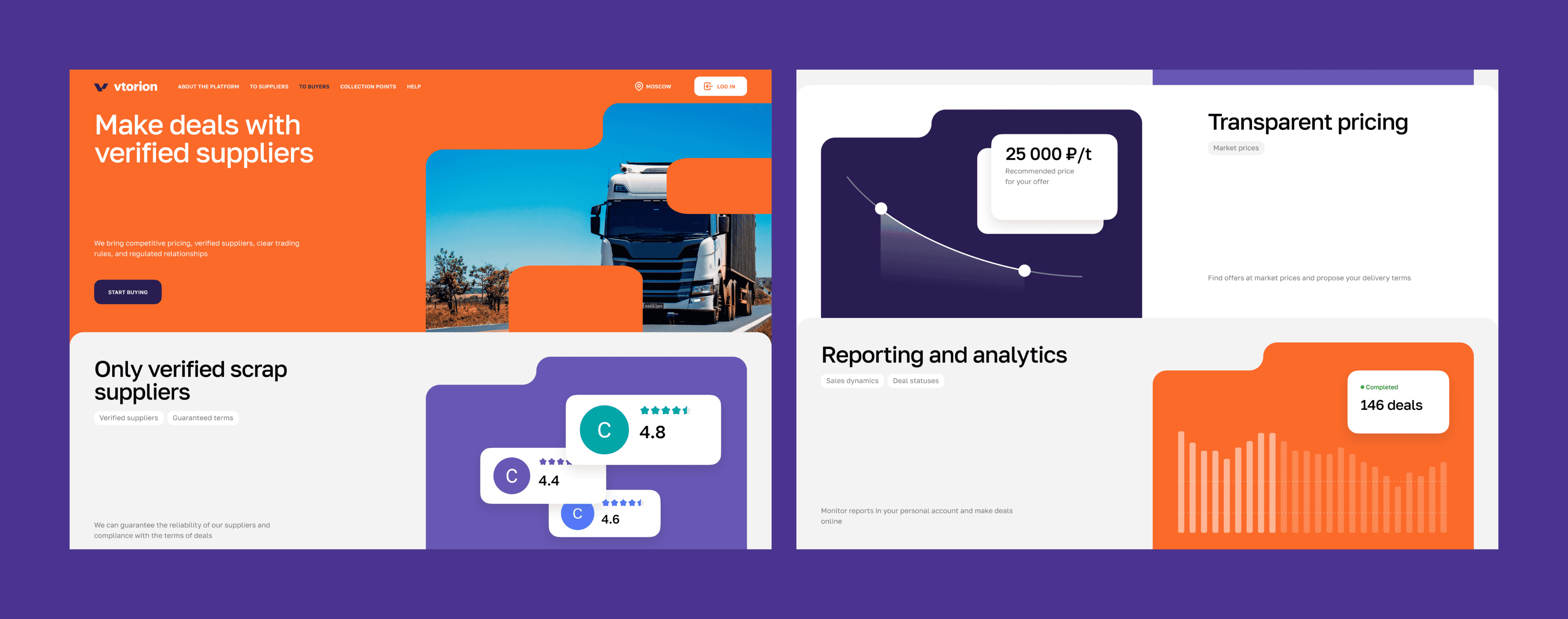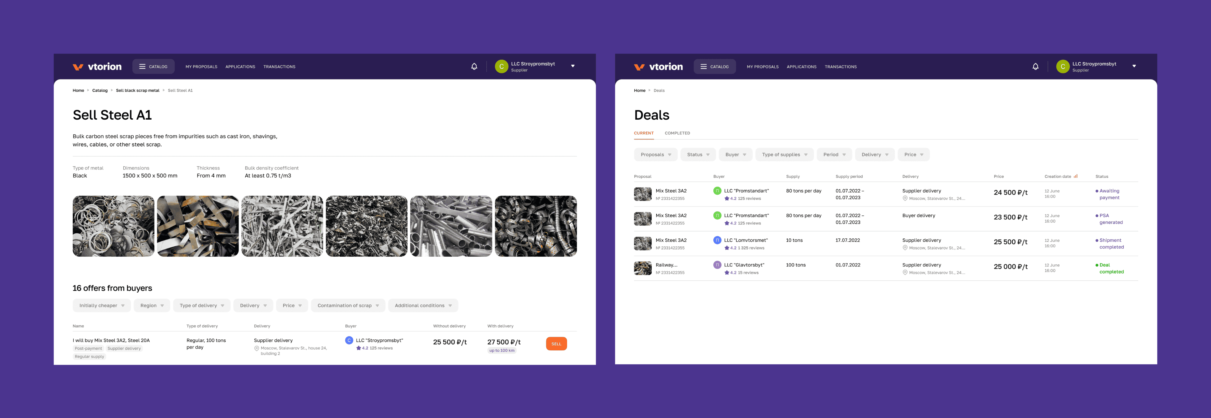 Since work on branding and naming was carried out simultaneously with the interface design, the scenario development began with prototypes. Then, the approved layouts were adapted to the branding. The platform's functionality includes a personal account (PA) for both suppliers and buyers, each with different catalogs and capabilities.